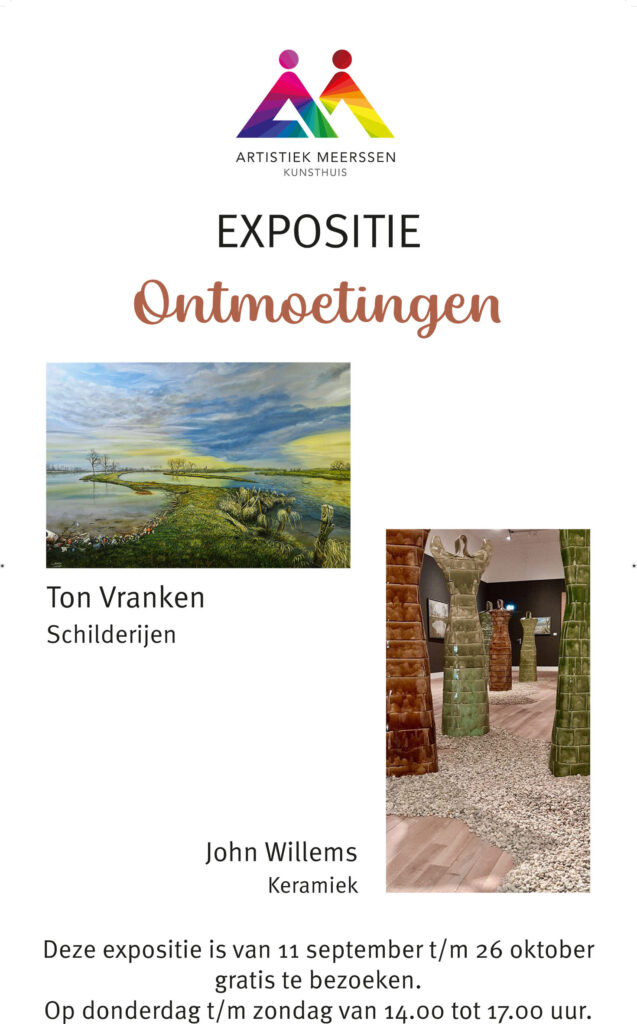 Welkom bij Kunsthuis Artistiek Meerssen Beekstraat 24 In kunsthuis Artistiek Meerssen worden regelmatig exposities georganiseerd en kunnen gevestigde en beginnende kunstenaars hun werken tentoonstellen. Geopend donderdag t/m zondag 11 september t/m 26 oktober 2025 14:00 - 17:00 uur Nieuwe expositieTon Vranken schilderijen John Willems keramiek